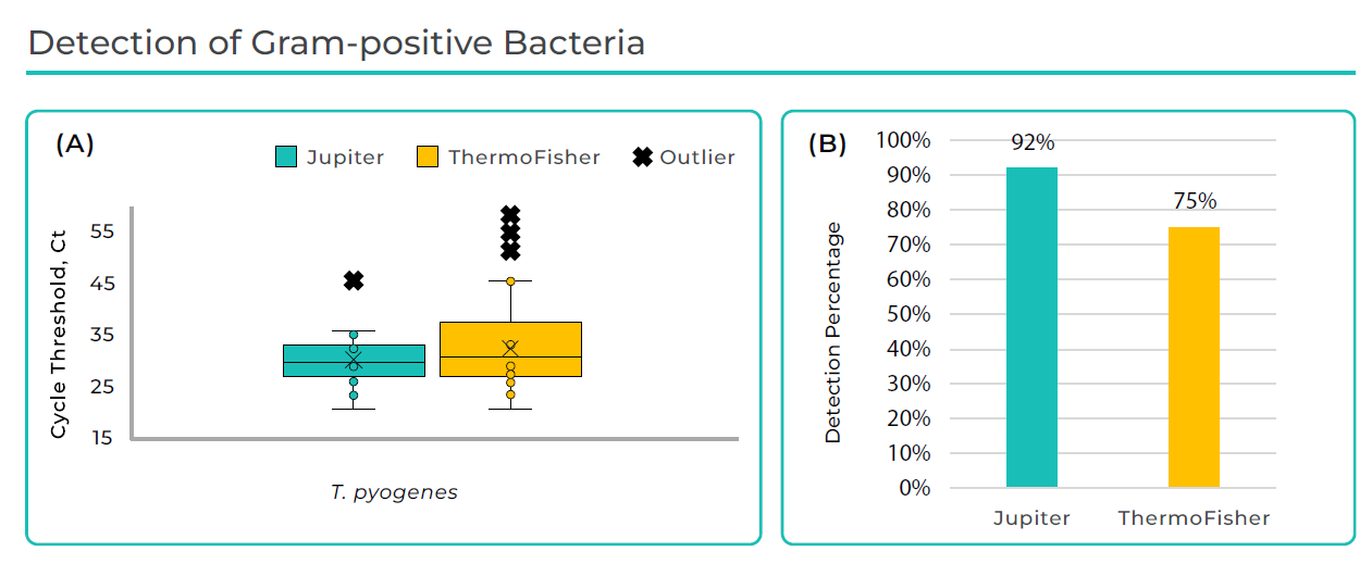 Gram-Positive Bacteria detection- Comparison of the performance of the Jupiter Universal Pathogen Kit versus MagMAX™ Pathogen RNA/DNA Kit (ThermoFisher) for the detection of the gram-positive bacteria Trueperella pyogenes. (A) Range of Ct values obtained for multiple samples using quantitative PCR for Trueperella pyogenes using Jupiter Universal Pathogen Kit and MagMAX™ Pathogen RNA/DNA Kit. (B) Percent of positively detected pathogen from the same collection of specimen samples (n=12) using Jupiter Universal Pathogen Kit and MagMAX™ Pathogen RNA/DNA Kit for T. pyogenes. A lower Ct value indicates a more sensitive and efficient purification of pathogenic nucleic acids.