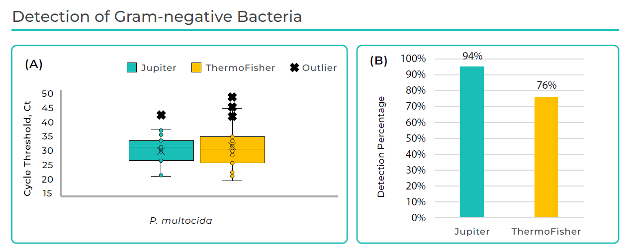 Gram-Negative Bacteria detection- Comparison of the performance of the Jupiter Universal Pathogen Kit versus MagMAX™ Pathogen RNA/DNA Kit (ThermoFisher) for the detection of the gram-negative bacteria Pasteurella multocida. (A) Range of Ct values obtained for multiple samples using quantitative PCR for Pasteurella multocida using Jupiter Universal Pathogen Kit and MagMAX™ Pathogen RNA/DNA Kit. (B) Percent of positively detected pathogen from the same collection of specimen samples (n=17) using Jupiter Universal Pathogen Kit and MagMAX™ Pathogen RNA/DNA Kit for T. pyogenes. A lower Ct value indicates a more sensitive and efficient purification of pathogenic nucleic acids.