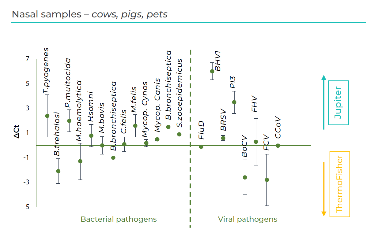 Nasal samples – cows, pigs, pets - ΔCt values of quantitative PCR results comparing (i) Jupiter Universal Pathogen Kit and (ii) MagMAX™ Pathogen RNA/DNA Kit (ThermoFisher). Specimens include nasal samples containing bacterial and viral pathogens. ΔCt values above 0 represent a better DNA/RNA extraction efficiency of Jupiter Universal Pathogen Kit versus MagMAX™ Pathogen RNA/DNA Kit.