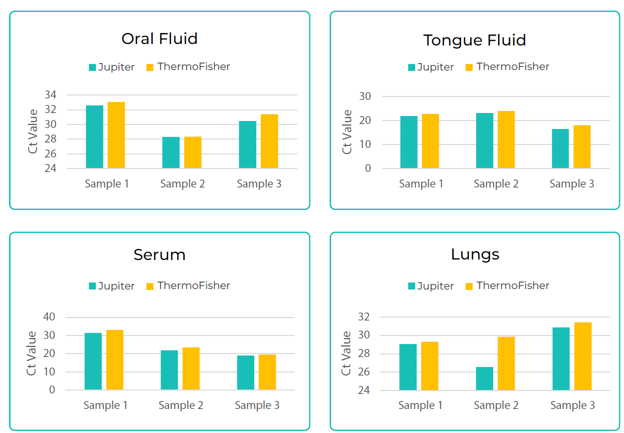 Detection of PRRS- Comparison of the performance of the Jupiter Universal Pathogen Kit versus MagMAX™ Pathogen RNA/DNA Kit (ThermoFisher) for the detection of PRRS (Porcine Reproductive and Respiratory Syndrome) for multiple samples and from different matrices (oral fluid, tongue fluid, serum, and lungs), using quantitative PCR.