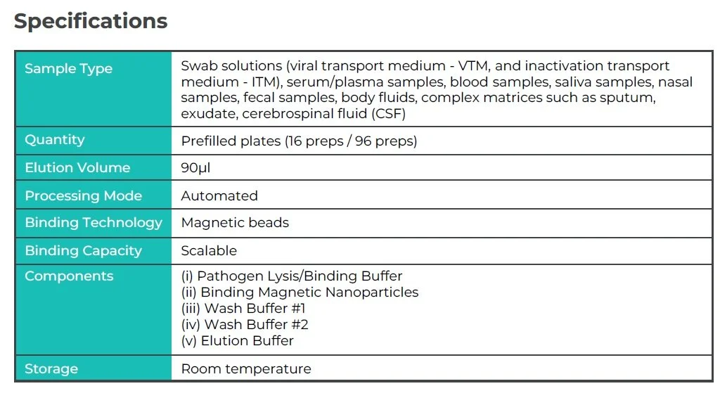 The magnetic beads used in the lysis buffer were developed to bind to DNA as well as RNA of different sizes with high specificity, without the use of Carrier RNA. This eliminates the need for any centrifugation step, filters, requires a minimal amount of collection tubes and can be easily applied to high throughput applications.It does not require any additives such as Proteinase K or RNA carrier.